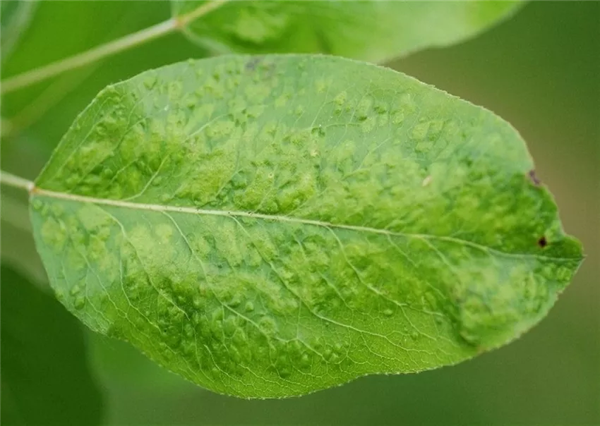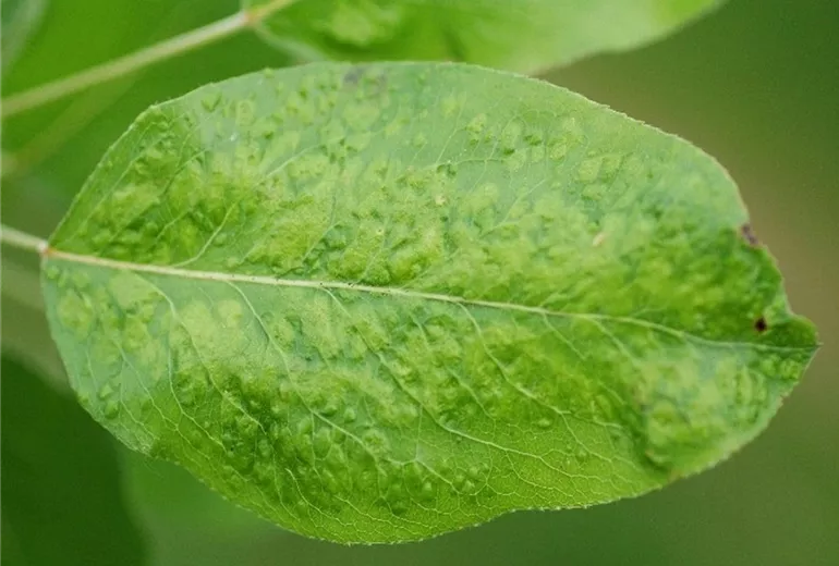Die genannten Schäden werden durch winzig kleine Gallmilben (Phytoptes pyri) verursacht, die mit bloßem Auge nicht erkennbar sind.