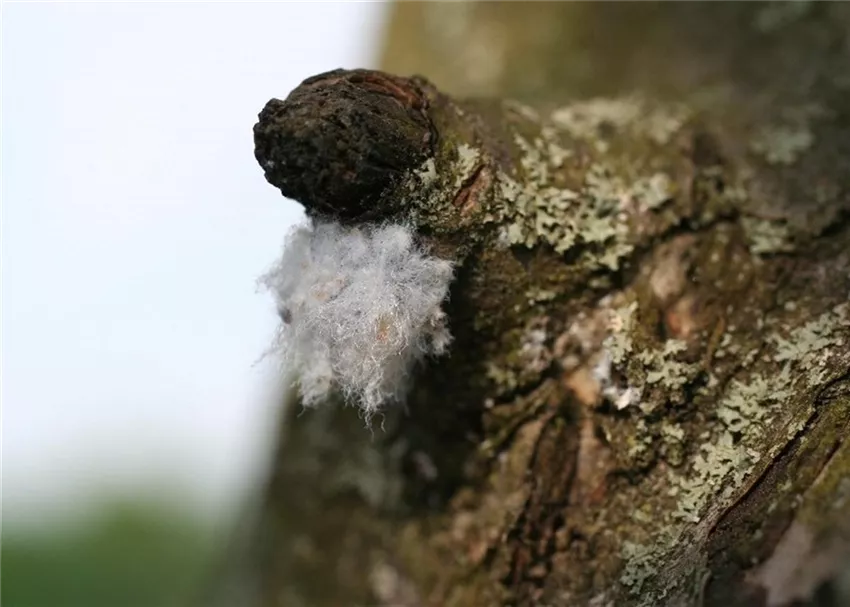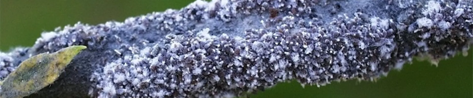 Ab Mitte Mai treten an Wund- und Schnittstellen, etwas später auch an jungen Trieben, bläulichweiße, wattebauschähnliche Gebilde auf. Darin befinden sich Kolonien plump gebauter bis 2 mm langer graubrauner Läuse.