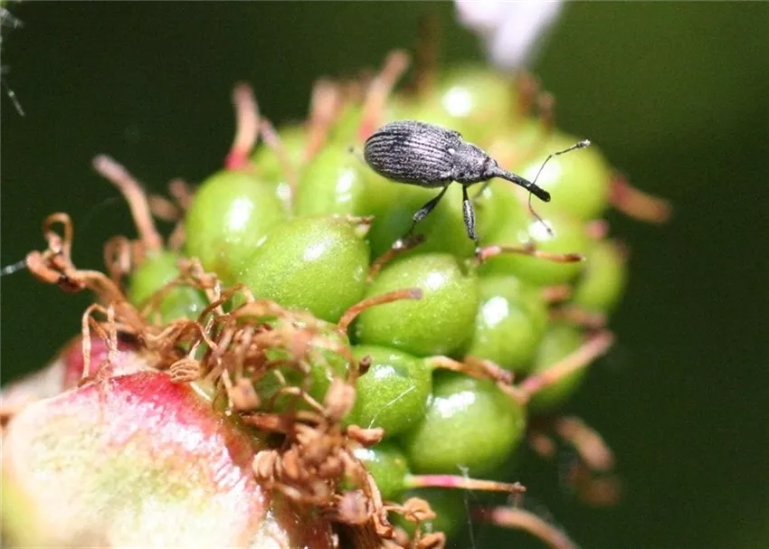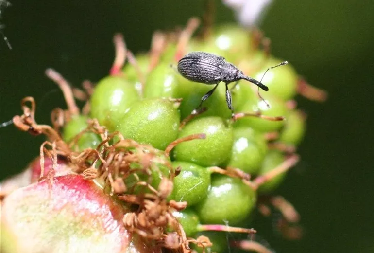 Der Blütenstecher (Anthonomus rubi) ist ein kleiner Rüsselkäfer, der seine Eier in die Blütenknospen von Erdbeeren, Brom- und Himbeeren legt, wo sich die weißlichen Larven entwickeln.
