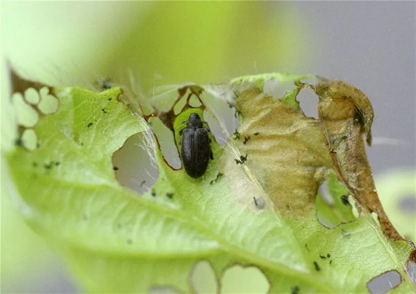 Im Sommer schlüpft die neue Käfergeneration und frisst erneut an den Blättern. Die Käfer des Vorjahres sterben ab.