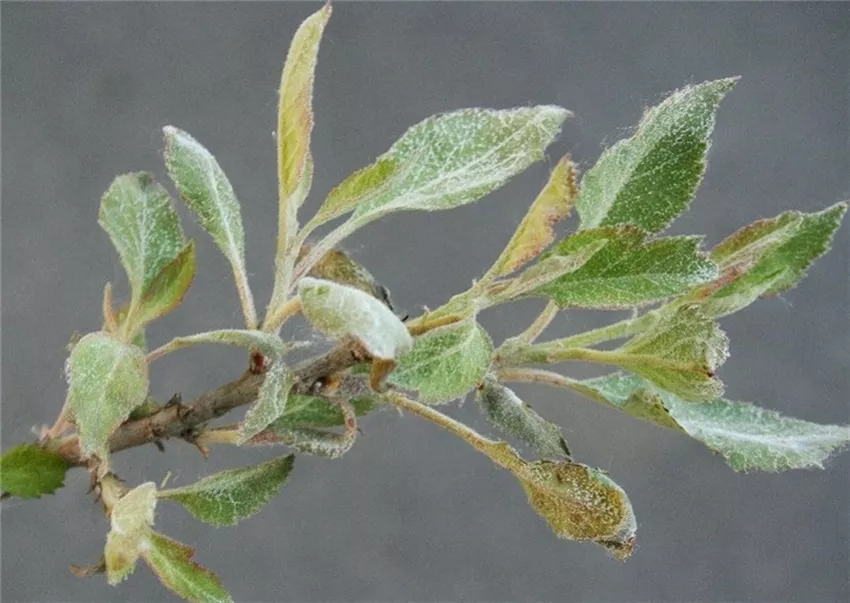 Im Mai und Juni sind die jungen Blätter und Triebe des Apfels, manchmal auch die der Quitte, ganz oder teilweise von einem weißen, mehlartigen Belag überzogen.