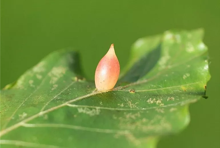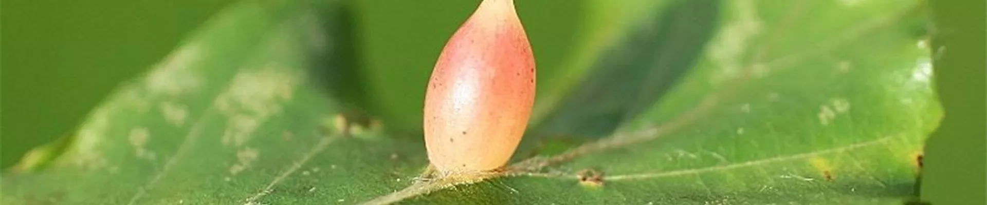 Auf der Blattoberseite bilden sich eiförmige Wucherungen von grüner bis rötlicher Farbe.
