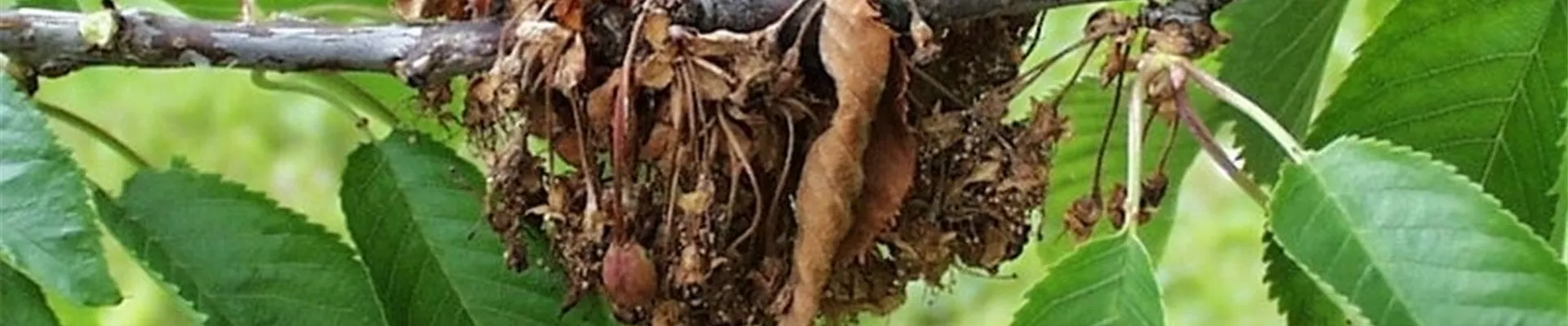Die Monilia Spitzendürre tritt zwar hauptsächlich an Sauerkirschen auf, ist aber auch immer wieder an Süßkirschen zu beobachten. Nach normalem Austrieb wird plötzlich ein großer Teil der Blüten braun und stirbt ab. Bei der Süßkirsche trocknen in Folge des Blütenbefalls meist nur die Kurztriebe ein, an denen die Blütenbüschel sitzen.