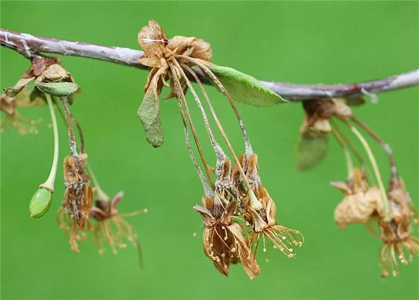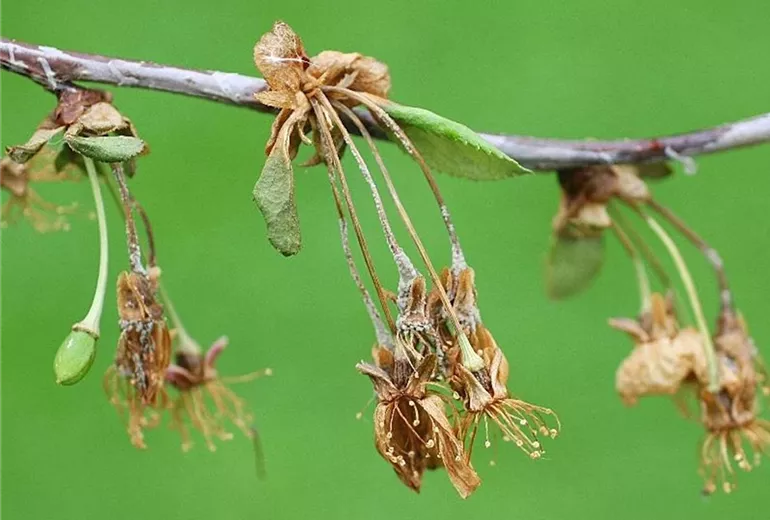 Nach normalem Austrieb wird plötzlich ein großer Teil der Blüten braun und stirbt ab. Kurz darauf trocknen die jungen Triebe ein.