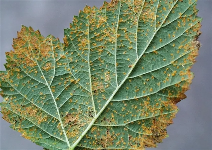 Auf den Blattoberseiten entstehen Flecken auf deren Unterseite sich anfangs orangene später grau-schwarze Sporenlager bilden.