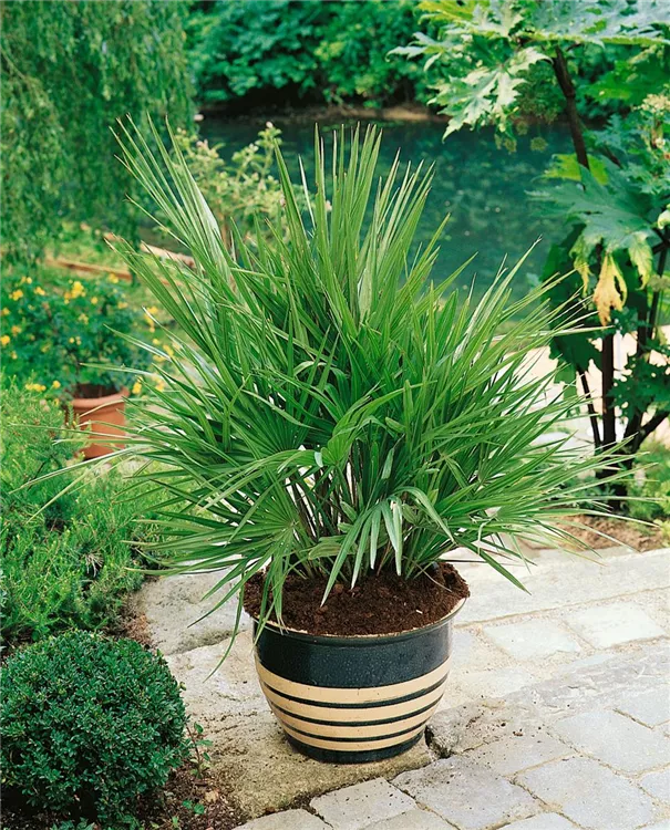 Die Zwergpalme (Chamaerops humilis) ist eine sehr beliebte Kübelpflanze. Verwenden Sie bevorzugt die spezielle Kübelpflanzenerde, denn sie verdichtet sich über längere Zeit nicht.