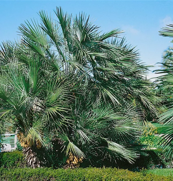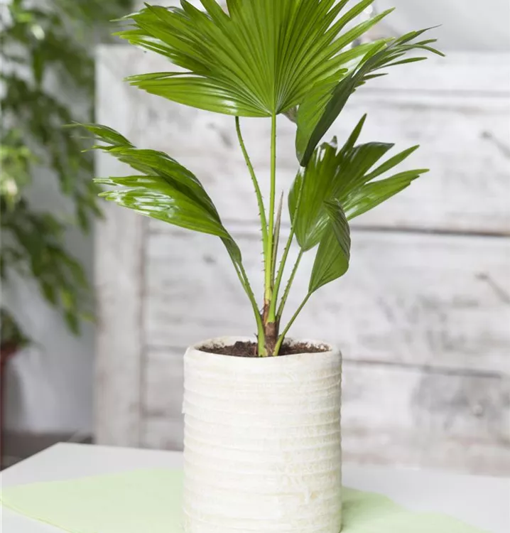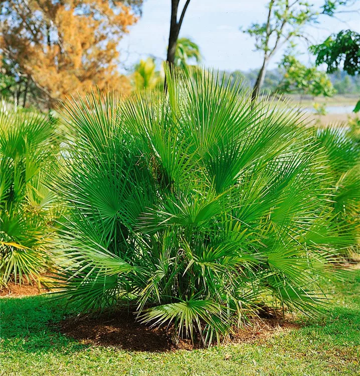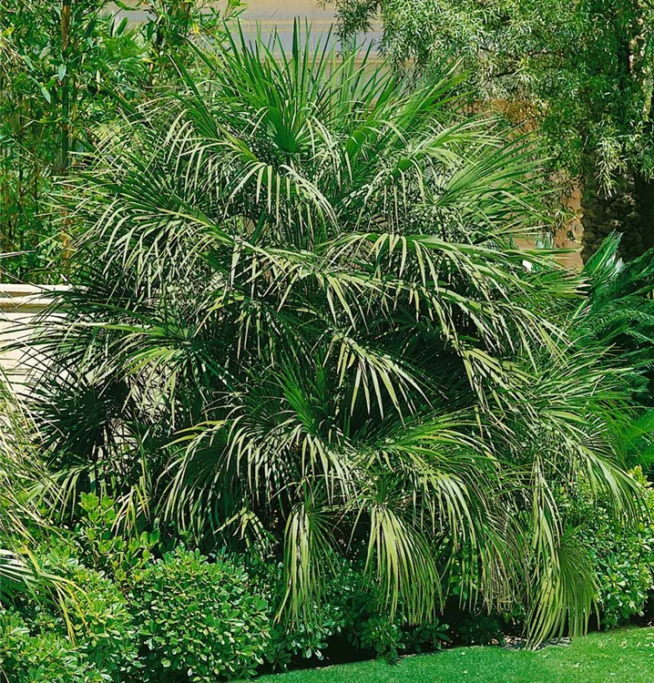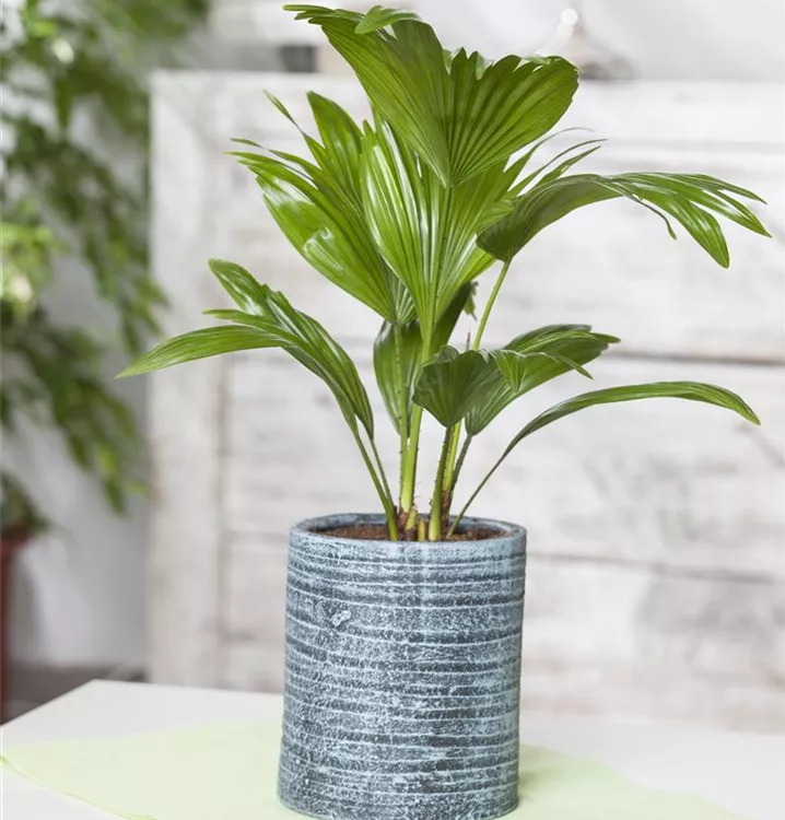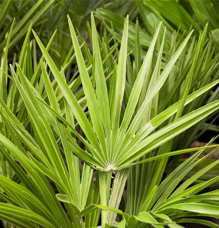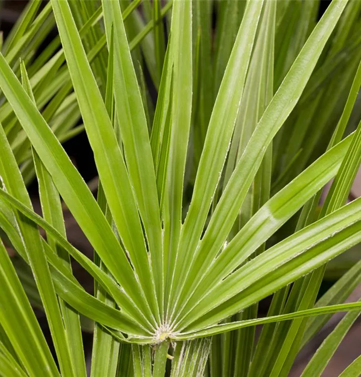 Die immergrünen Blätter der Zwergpalme sind grau-grün, tief geschlitzt.