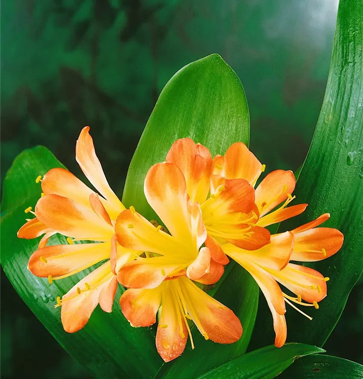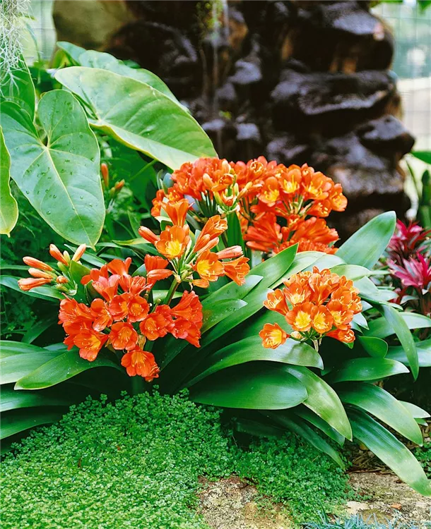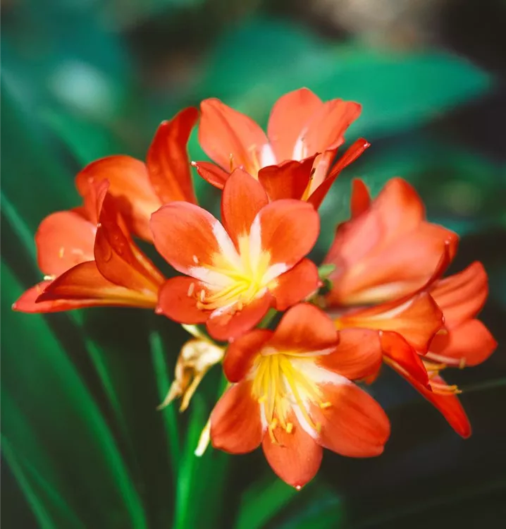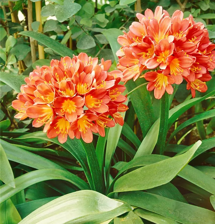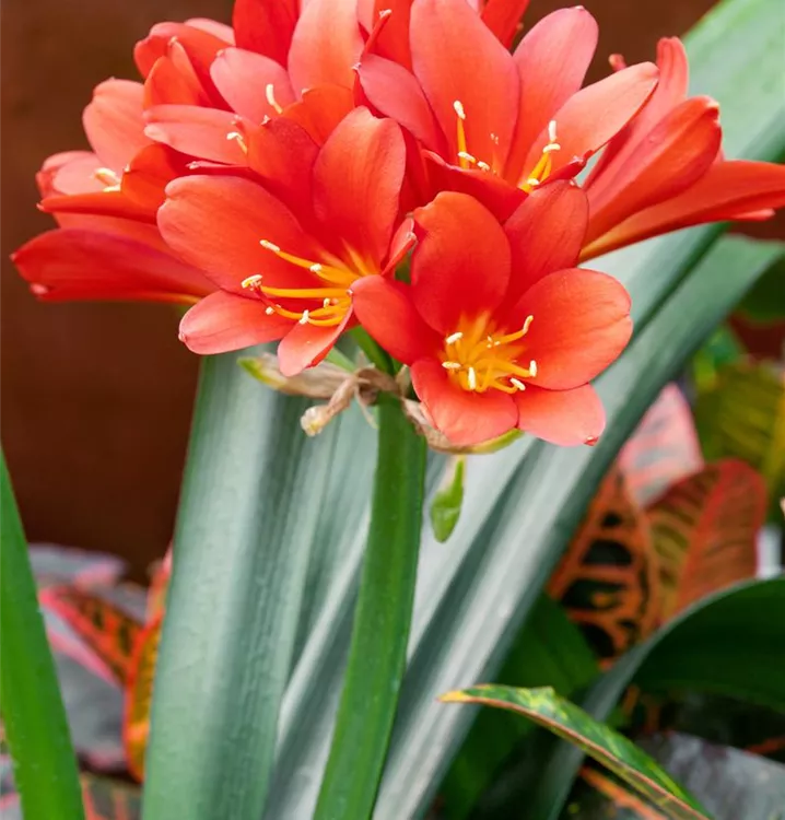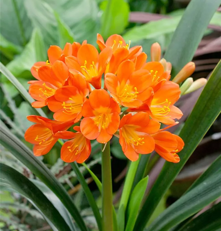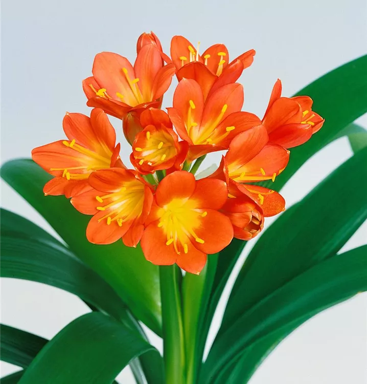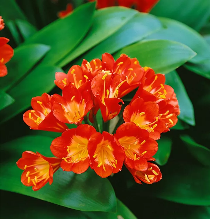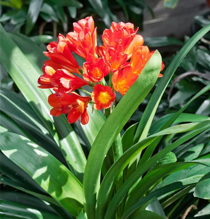 Clivia miniata bildet während der gesamten Saison zahlreiche trichterförmige, in Dolden angeordnete, mehrfarbige Blüten.