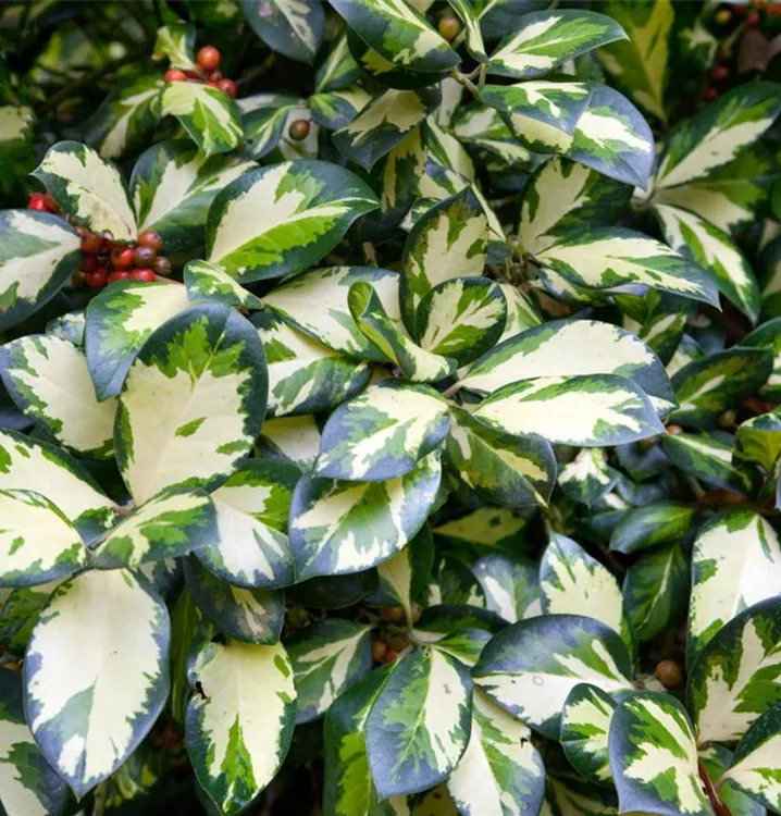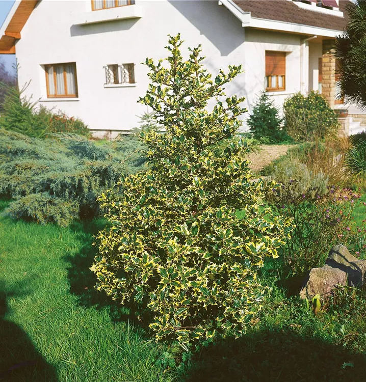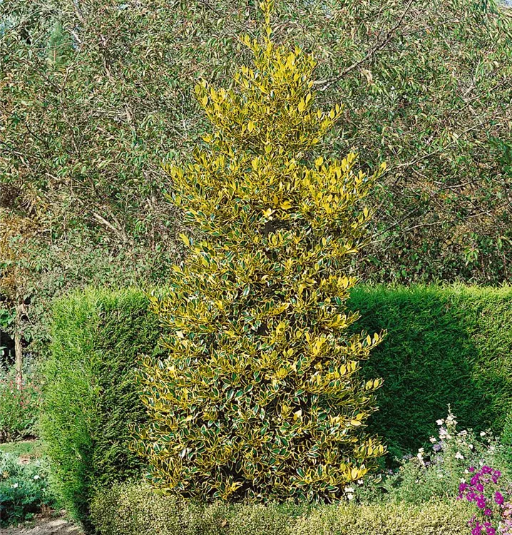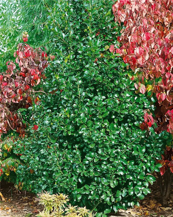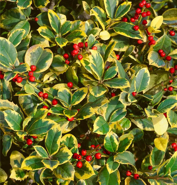 Die Großblatt-Stechpalme (Ilex altaclerensis) ist ein buschiger Großstrauch mit dekorativen, leuchtend roten Früchten. Die Blüten erscheinen je nach Sorte in verschiedenen Farben.