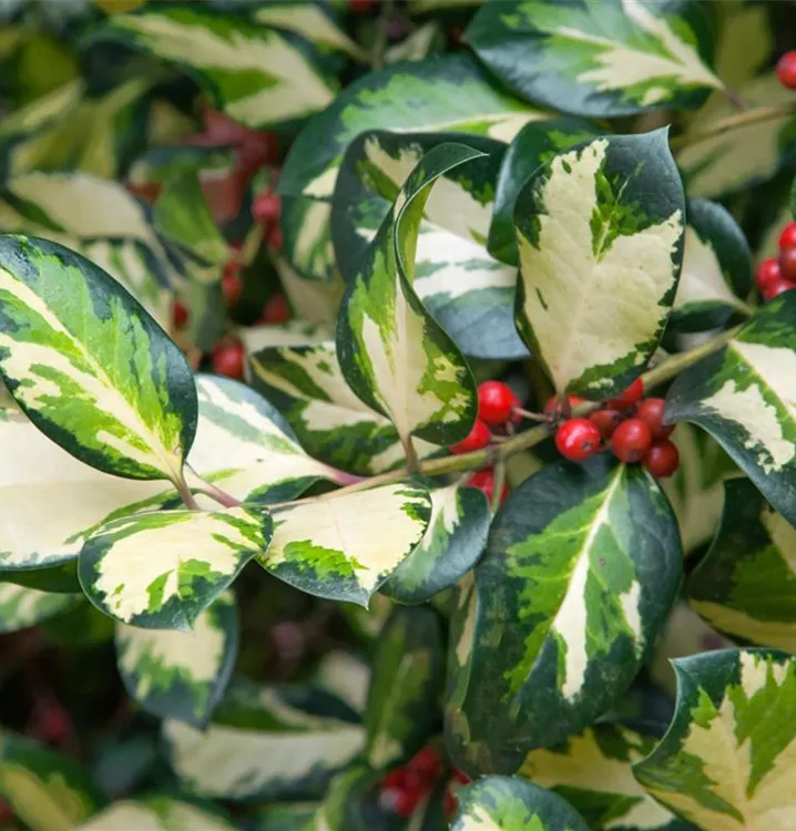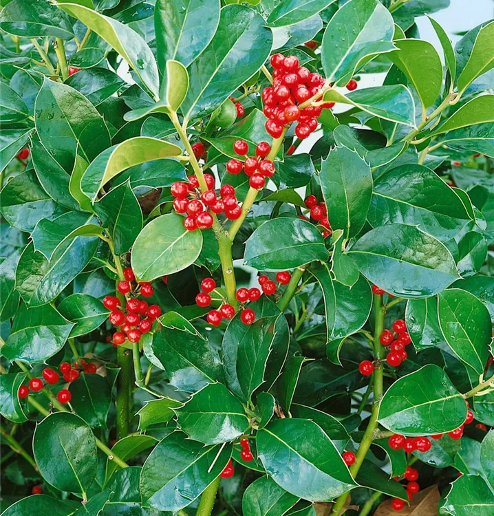 Besonders dekorativ sind die leuchtend roten Beeren von Ilex altaclerensis. Diese erscheinen ab Oktober.