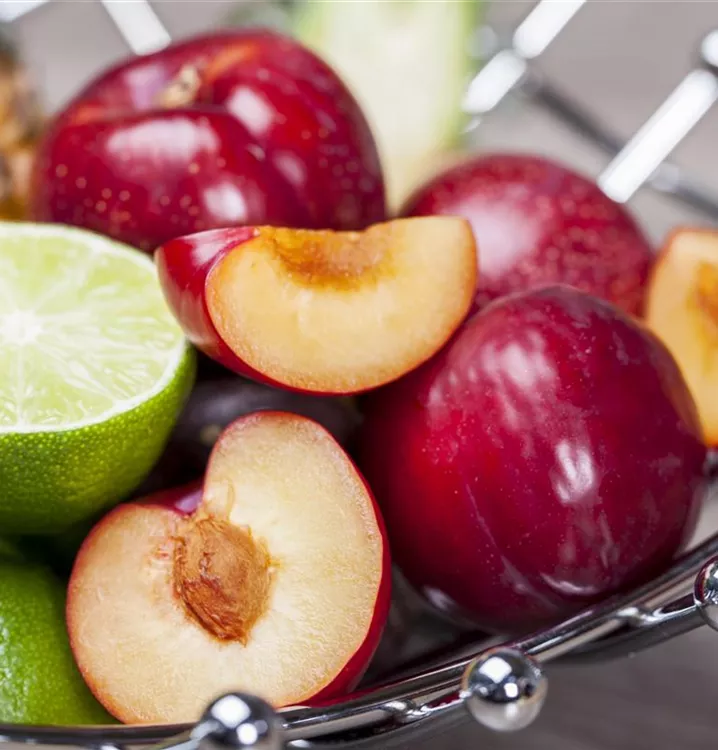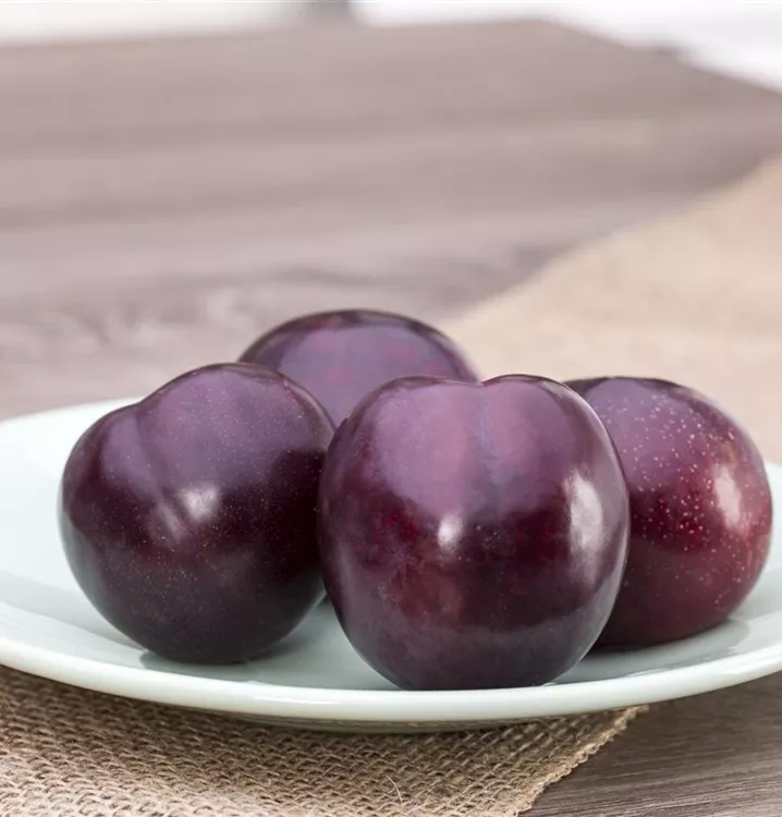 Die Pflaume (Prunus domestica) bildet purpurviolette Früchte. Sie haben einen süß-säuerlichen Geschmack. Für eine ertragreiche Ernte ab August schaffen durchlässiger, humoser Boden und ein sonniger bis halbschattiger Standort optimale Bedingungen. Auch ihre weißen Blüten sind eine schöne Erscheinung.