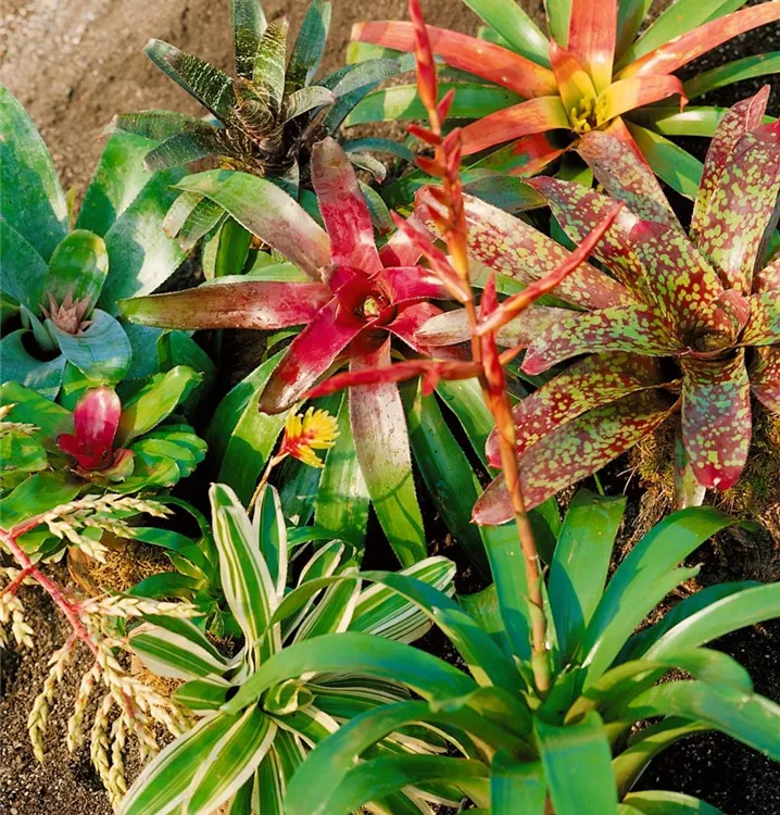 Die Bromelie (Bromelia) blüht über Monate hinweg. Je nach Sorte, erscheinen die dekorativen Blüten in den Farben Rot, Gelb, Orange und Rosa. Bevorzugt wird ein sonniger bis halbschattiger Standort und eine durchlässige Erde.
