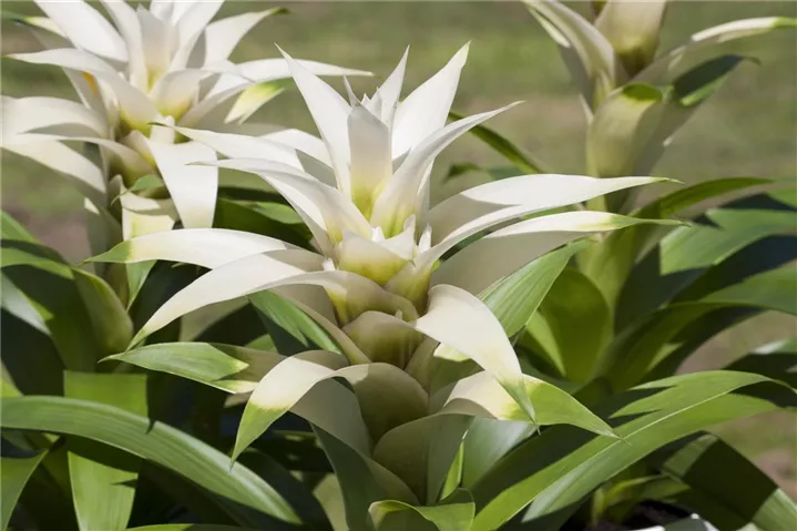 Die Blätter der Bromelie sind mittelgrün, lineal.