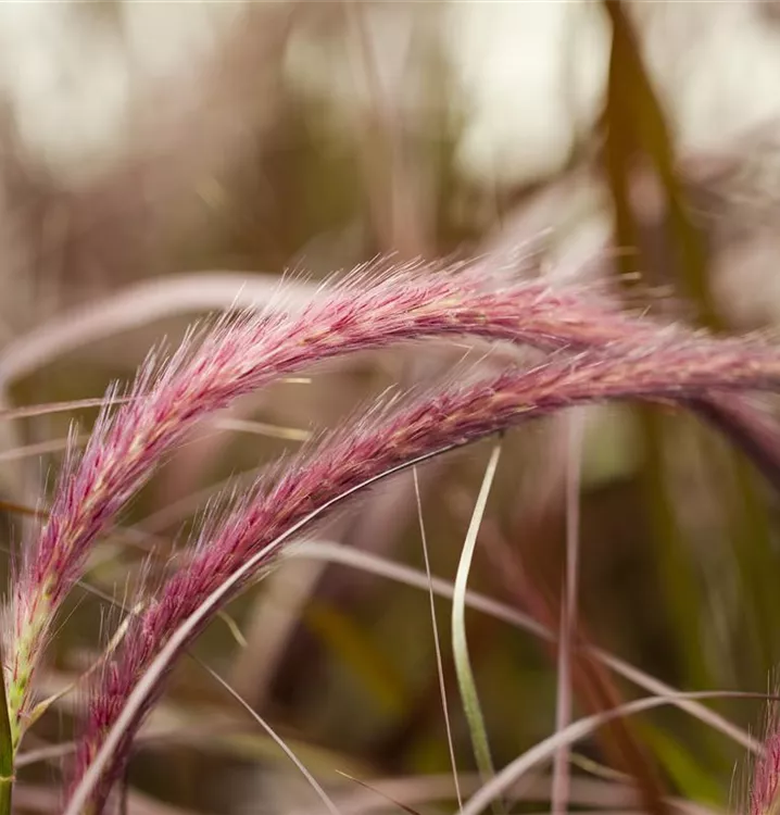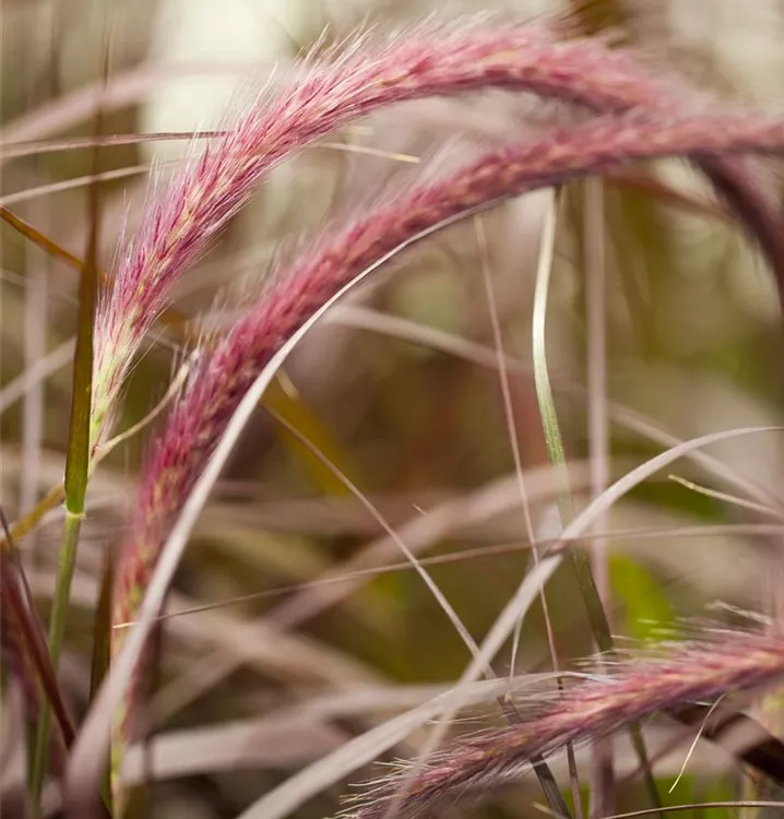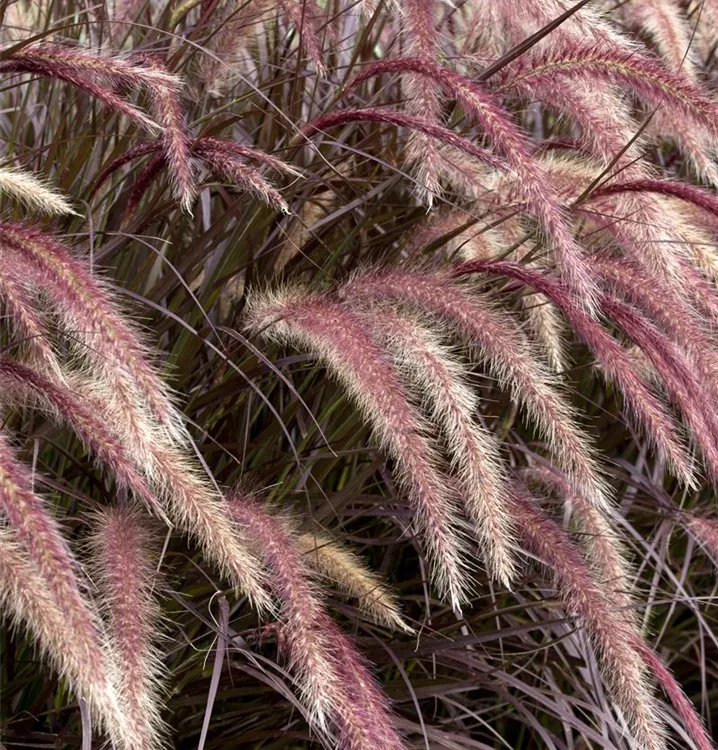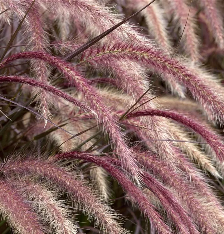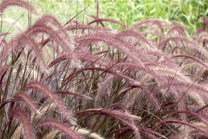 Das Federborstengras 'Rubrum' (Pennisetum setaceum) ist mit seiner dunkelroten Blattfärbung ein dekoratives Gestaltungselement im Garten, welches sich an einem sonnigen Standort mit einem möglichst durchlässigen, nährstoffreichen Boden am wohlsten fühlt. Die roten Blütenwedel schmücken die buschig und aufrecht wachsende Pflanze ab Sommer. Bei günstigen Bedingungen erreicht dieses Gras eine Höhe von ca. 50 cm und wird bis zu 50 cm breit.