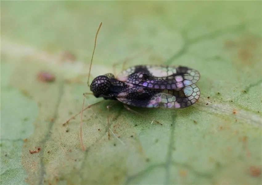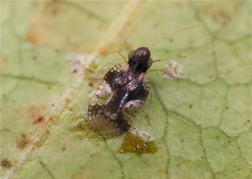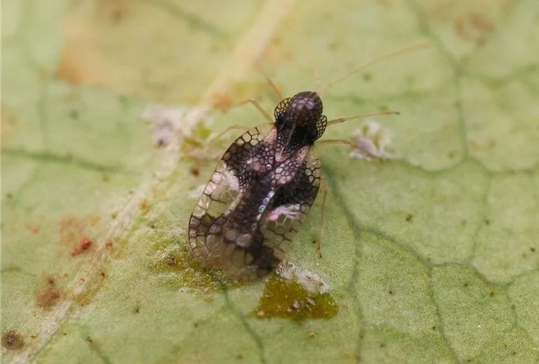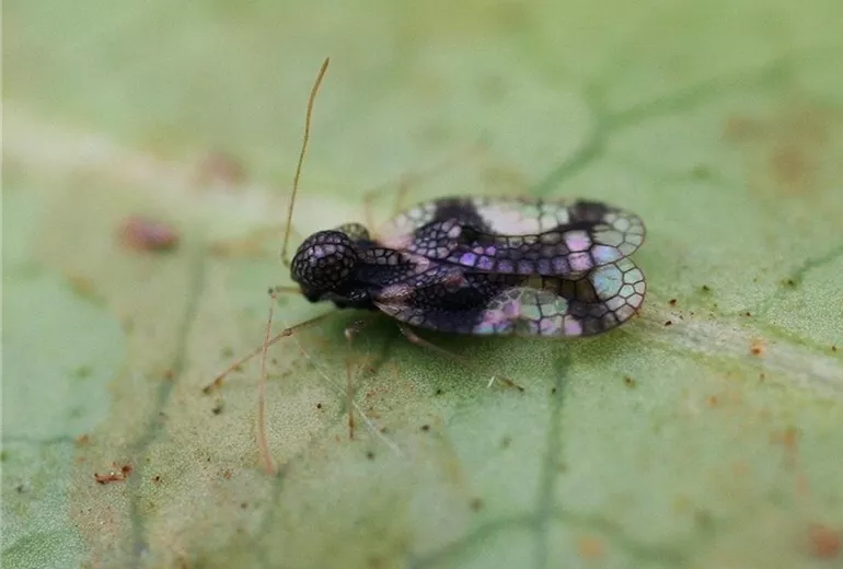 Auf befallenen Blättern sind neben den 3 bis 4 mm großen Tieren auch schwarze, lackartige Pünktchen zu sehen. Es handelt sich dabei um Kottröpfchen.