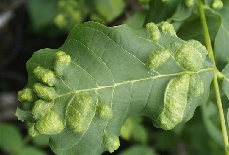 Auf den Blättern bilden sich blasige Aufwölbungen, deren Unterseite von einem weißlichen Haarfilz bedeckt ist, der sich später braun färbt.