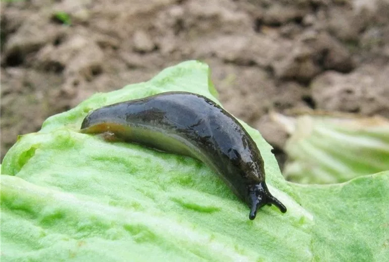 Nacktschnecken verursachen an Gemüse, Zierpflanzen und Erdbeeren Fraßschäden. Oft sieht man an geschädigten Pflanzen auch noch die eingetrockneten Schleimspuren.