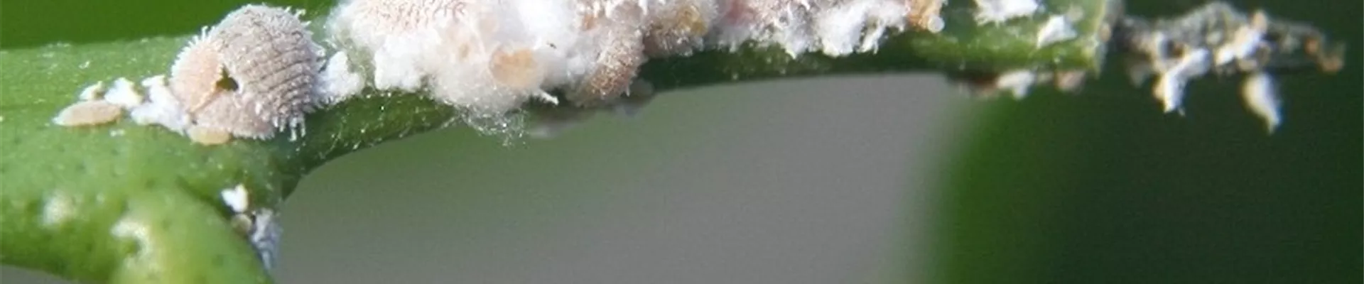 Auf Blättern und Trieben - bei Kakteen auch am Wurzelhals - sitzen in weißen Watteflocken die unscheinbaren cremefarbenen Schmierläuse.