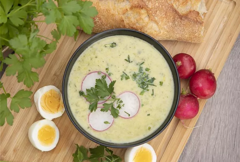 Die Eier pellen und halbieren. Die Suppe kann dann mit übrigen Kräutern, Radieschenscheiben und den Eihälften angerichtet werden.