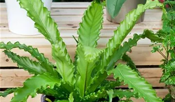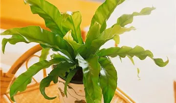 Hoher Blattschmuckwert. Die immergrünen Blätter des Nestfarns sind smaragdgrün, lineal, gewellt.