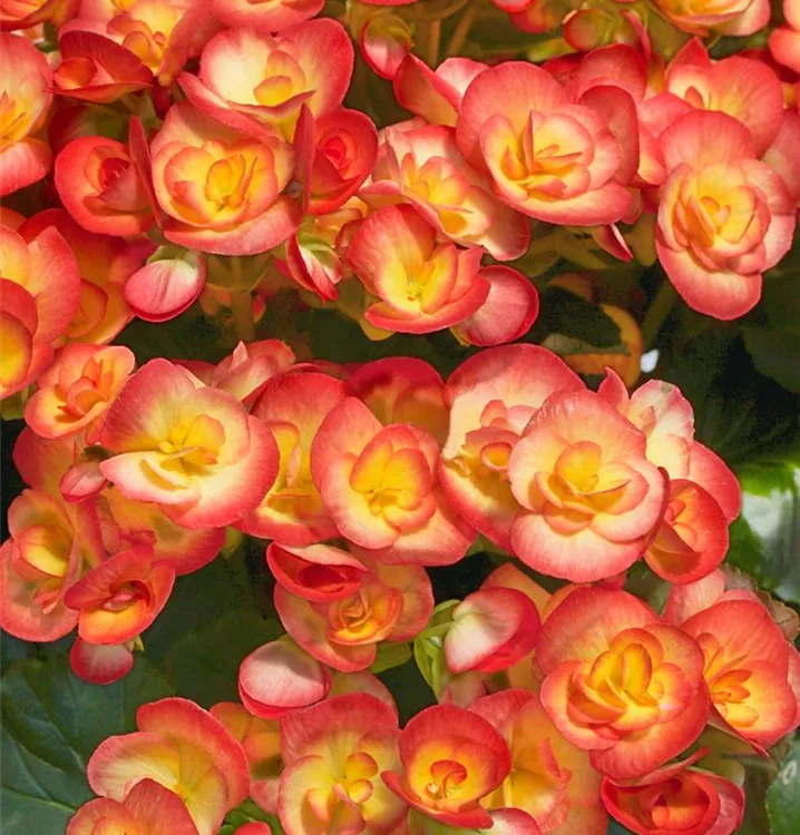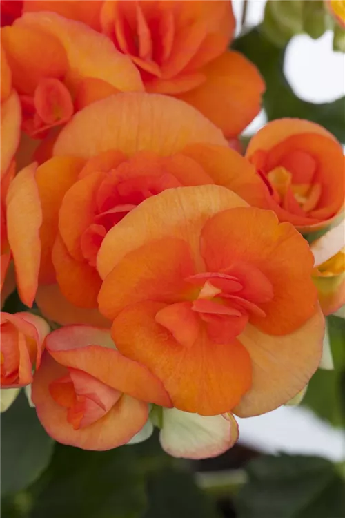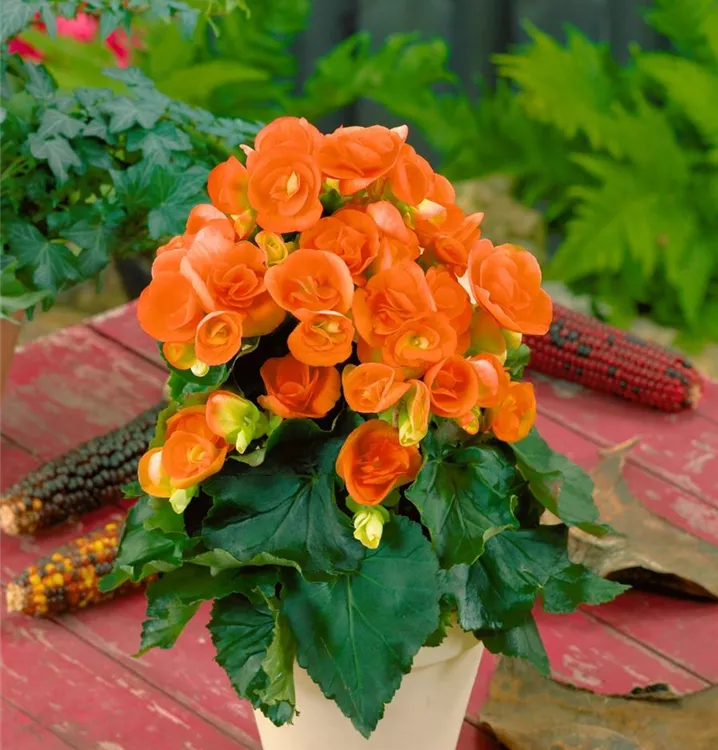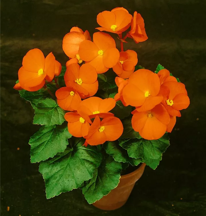 Die Begonie (Begonia elatior) ist eine orange blühende Pflanze, die dreieckige, gesägte Blätter trägt. Ihre schalenförmigen Blüten erscheinen von April bis September. Diese kompakte Pflanze gedeiht am besten an einem sonnigen bis halbschattigen Standort.
