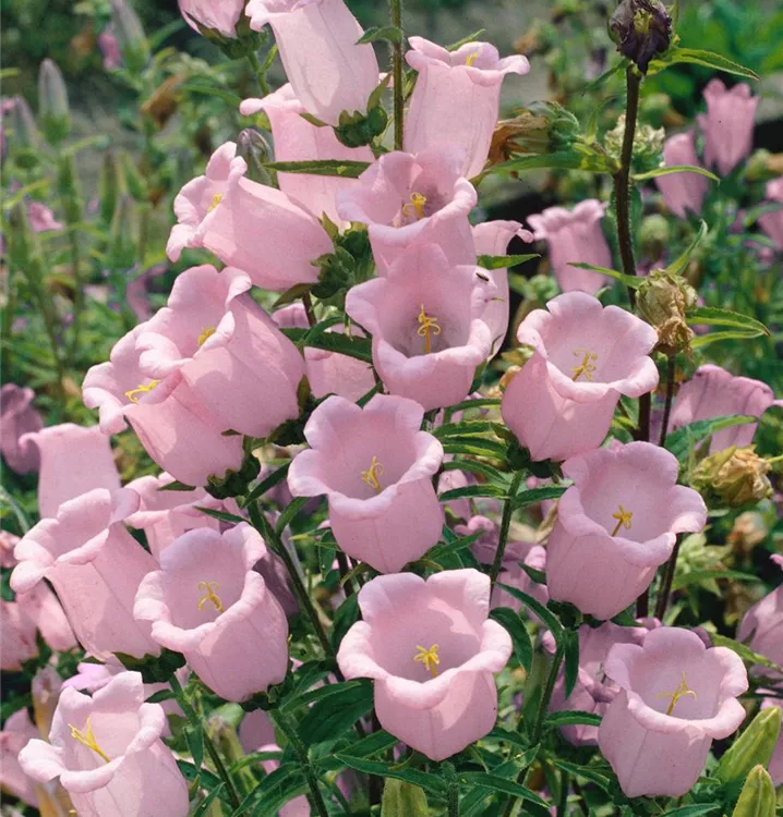 Die Marien-Glockenblume 'Poem' (Campanula medium) ist eine aufrechte wintergrüne Staude, die, je nach Sorte, glockenförmige Blüten in verschiedenen Farben bildet. An einem sonnigen bis halbschattigen Standort mit durchlässigem, lockerem, nährstoffreichem Boden erreicht sie gewöhnlich eine Höhe von ca. 1 m und wird ca. 60 cm breit. Die Marien-Glockenblume 'Poem' ist gut frostverträglich.
