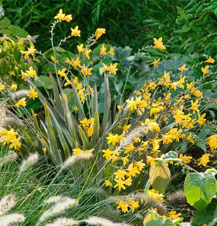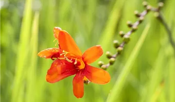 Die Bastard-Montbretie (Crocosmia x crocosmiiflora) blüht über Monate hinweg. Je nach Sorte, erscheinen die dekorativen Blüten in den Farben Gelb und Orange. Bevorzugt wird ein sonniger Standort und eine durchlässige Erde.