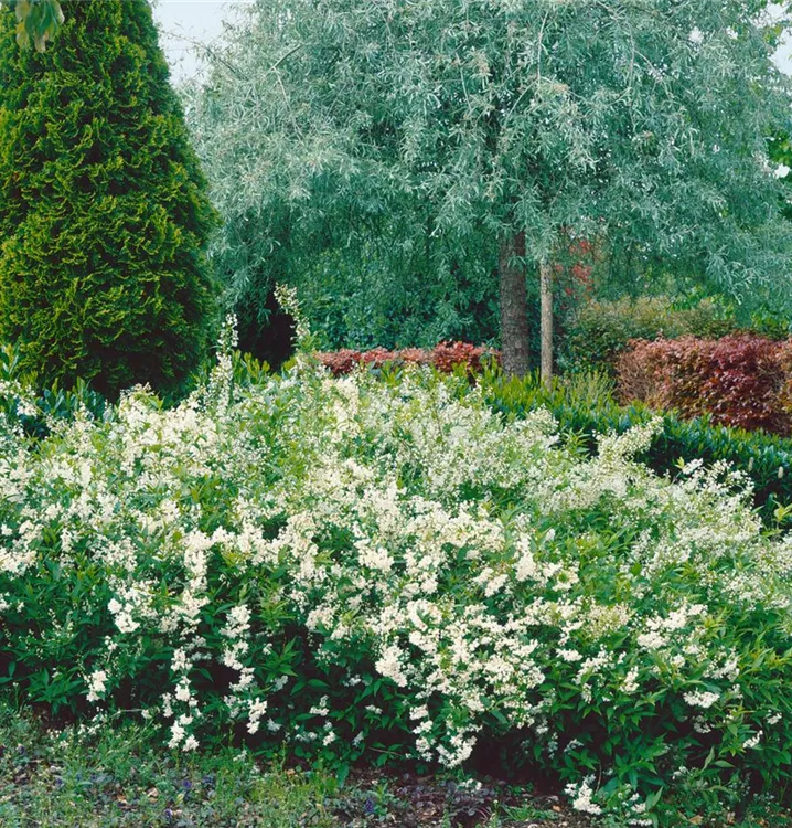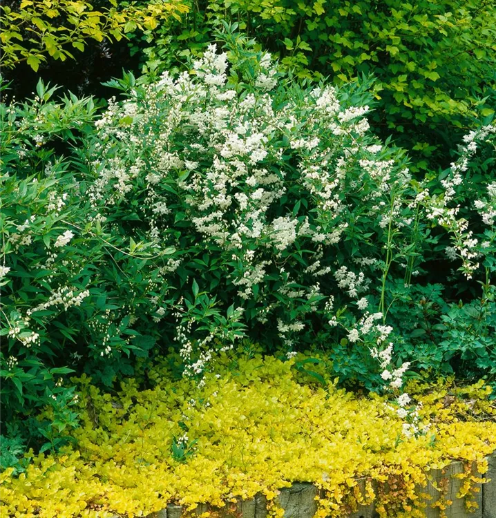 Der Maiblumenstrauch (Deutzia gracilis) ein buschiger, aufrechter, dichter Kleinstrauch, der, je nach Sorte, glockenförmige Blüten in verschiedenen Farben hervorbringt. An einem sonnigen Standort mit durchlässigem, nährstoffreichem Boden erreicht er gewöhnlich eine Höhe von ca. 80 cm und wird ca. 1 m breit.