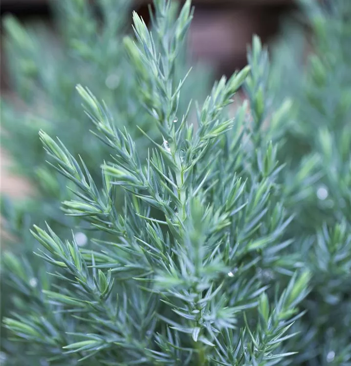 Der Blaue Kegel-Mooswacholder 'Stricta' (Juniperus chinensis) ist ein Großstrauch, welcher kegelförmig, aufrecht wächst und gewöhnlich eine Höhe von ca. 4 m und eine Breite von ca. 1,5 m erreicht. Seine nadelförmigen Blätter haben eine blau-grüne Färbung. Dieses Gehölz ist gut frostverträglich. Er bevorzugt durchlässigen Boden in sonniger Lage.