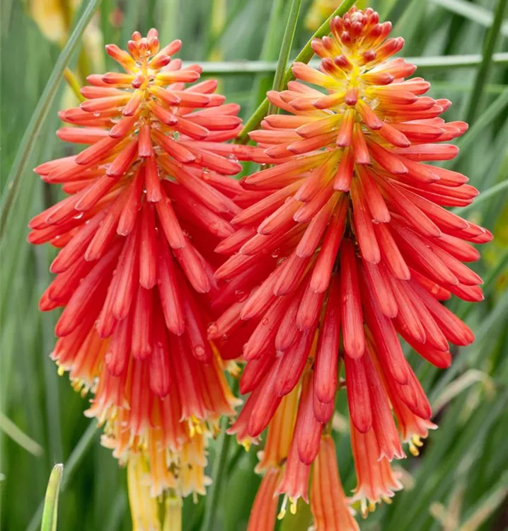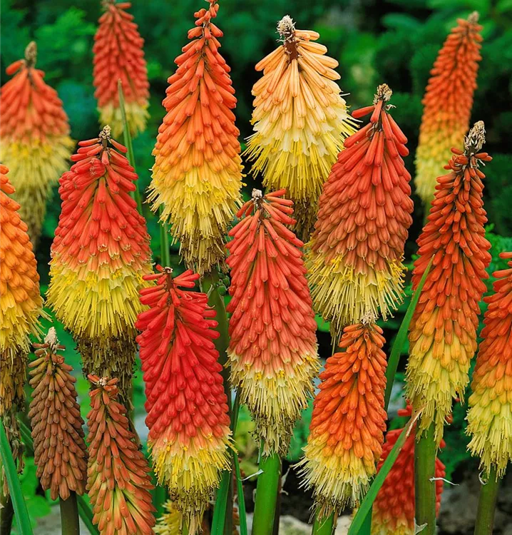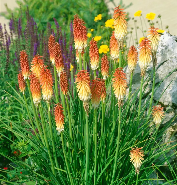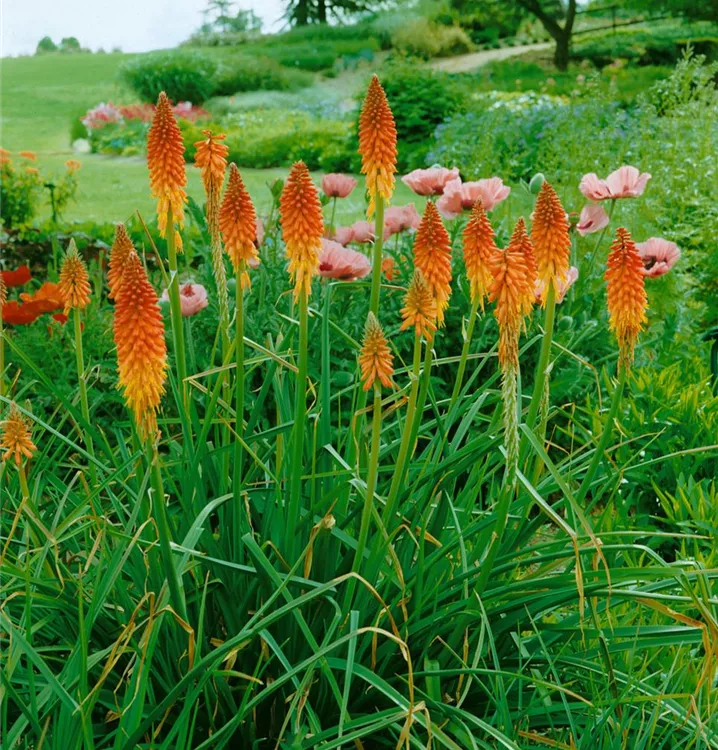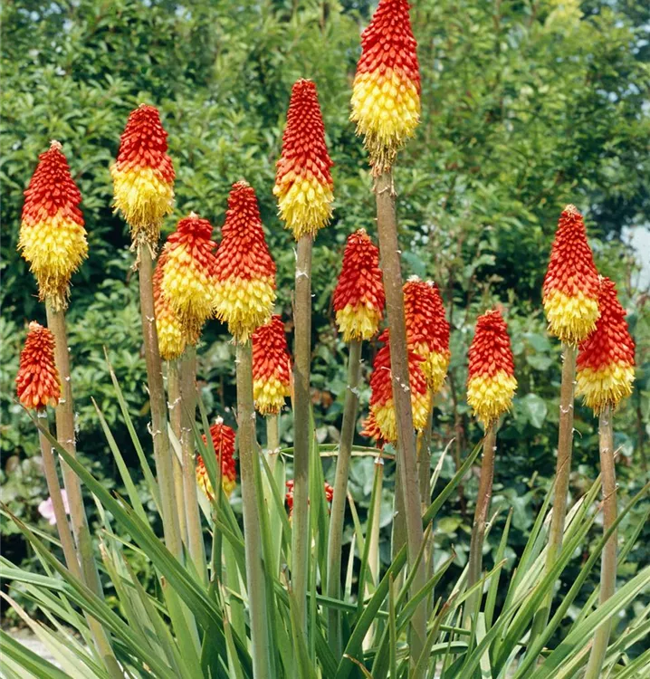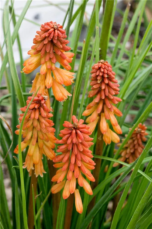 Die Garten-Fackellilie (Kniphofia uvaria) ist eine aufrechte, horstbildende, lockere wintergrüne Staude, die von Juli bis September orange-rote, in Kolben angeordnete Blüten bildet. An einem sonnigen Standort mit durchlässigem Boden erreicht sie gewöhnlich eine Höhe von ca. 1 m und wird ca. 50 cm breit. Die Garten-Fackellilie ist gut frostverträglich.