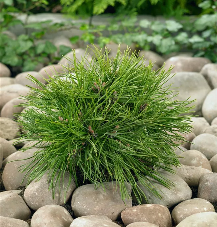 Berg-Kiefer 'Benjamin' ist ein kompakt und kugelförmig wachsender Zwergstrauch mit lockerer Krone. Sie erreicht gewöhnlich eine Höhe von 40 - 60 cm und wird ca. 40 - 60 cm breit. Langsam wachsend.