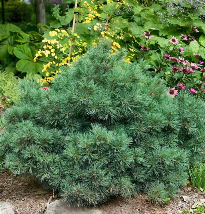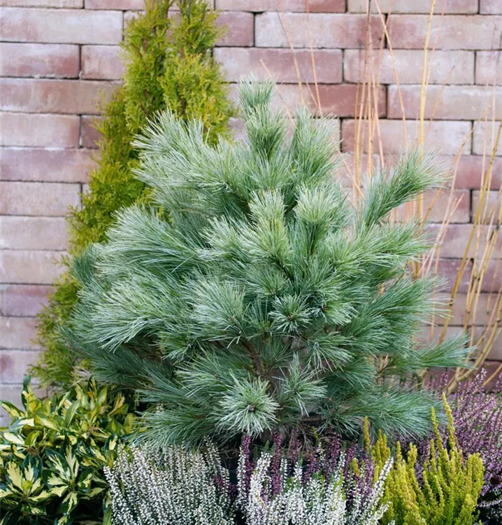 Weymouths-Kiefer 'Blue Shag' ist kegelförmig im Aufbau. Langsam wachsend.