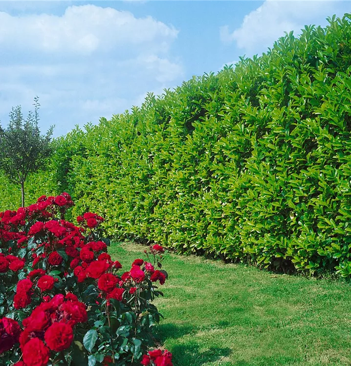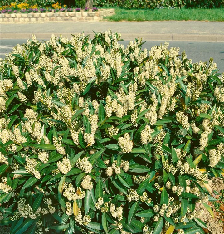 Die Lorbeerkirsche (Prunus laurocerasus) ein Großstrauch, der, je nach Sorte, Blüten in verschiedenen Farben hervorbringt. An einem sonnigen bis halbschattigen, windgeschützten Standort mit durchlässigem, nährstoffreichem Boden erreicht sie gewöhnlich eine Höhe von ca. 5 m und wird ca. 4 m breit.
