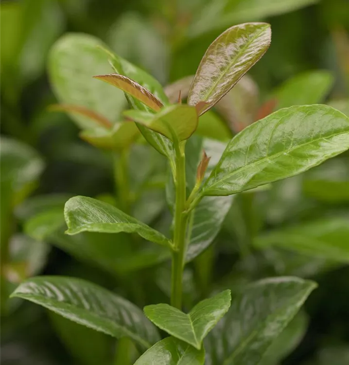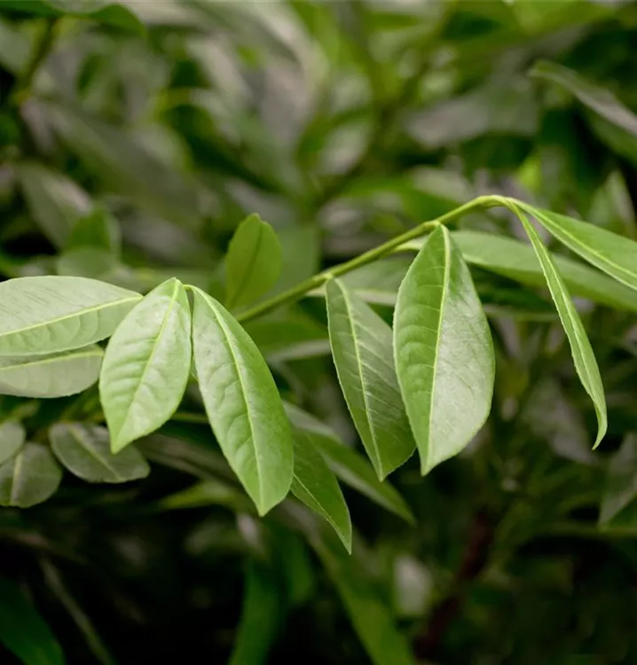 Die immergrünen Blätter der Lorbeerkirsche sind dunkelgrün, eiförmig, glänzend, wechselständig.
