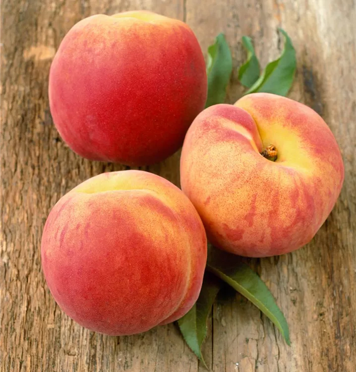 Die rot-gelben Steinfrüchte haben einen süßen Geschmack. Das weiße Fruchtfleisch ist saftig. Reifezeit ab September.