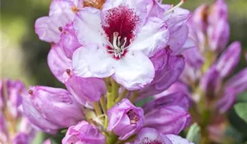 Der Rhododendron-Hybride 'Cassata' (Rhododendron) bringt von Mai bis Juni ein wahres Meer aus rosa-weißen Blüten hervor. Dieses aufrecht, dicht, kompakt, rundlich wachsende Gehölz erreicht gewöhnlich eine Höhe von 1,3 - 1,5 m und eine Breite von 1 bis 1,2 m. Ein halbschattiger (bis schattiger) Standort und ein humoser, kalkfreier Boden schaffen optimale Bedingungen für ein gesundes Wachstum. Der Rhododendron-Hybride 'Cassata' ist gut frostverträglich.