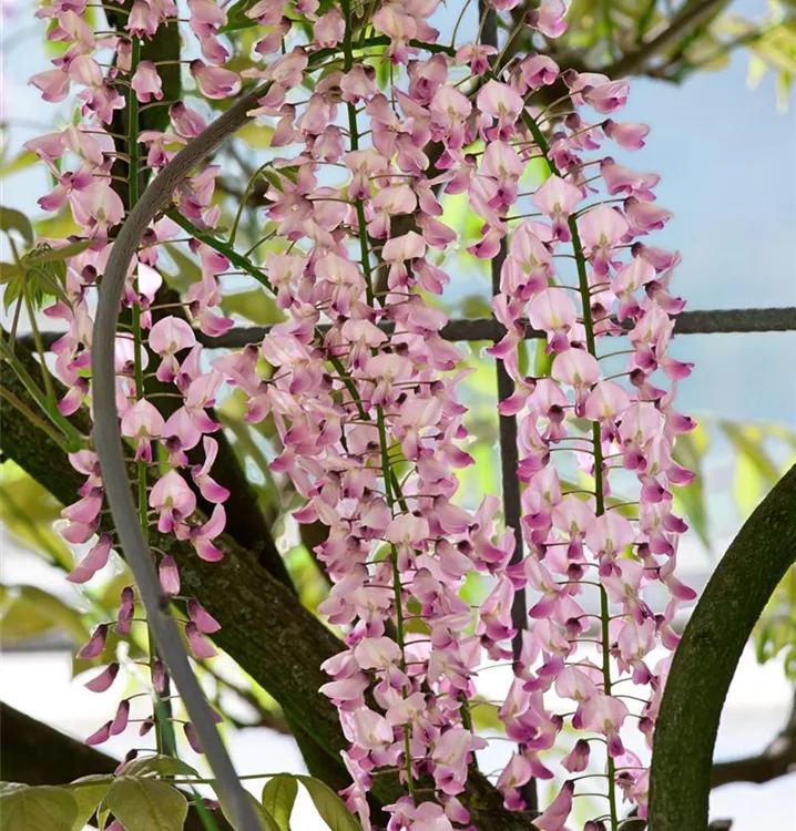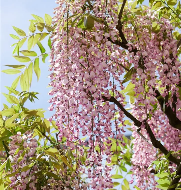 Der Japanische Blauregen (Wisteria floribunda) eine rankende, verzweigte Gartenpflanze, die, je nach Sorte, Blüten in verschiedenen Farben hervorbringt. An einem sonnigen bis halbschattigen, windgeschützten Standort mit durchlässigem, sandigem, saurem, lehmigem Boden erreicht er gewöhnlich eine Höhe von ca. 8 m und wird ca. 6 m breit.